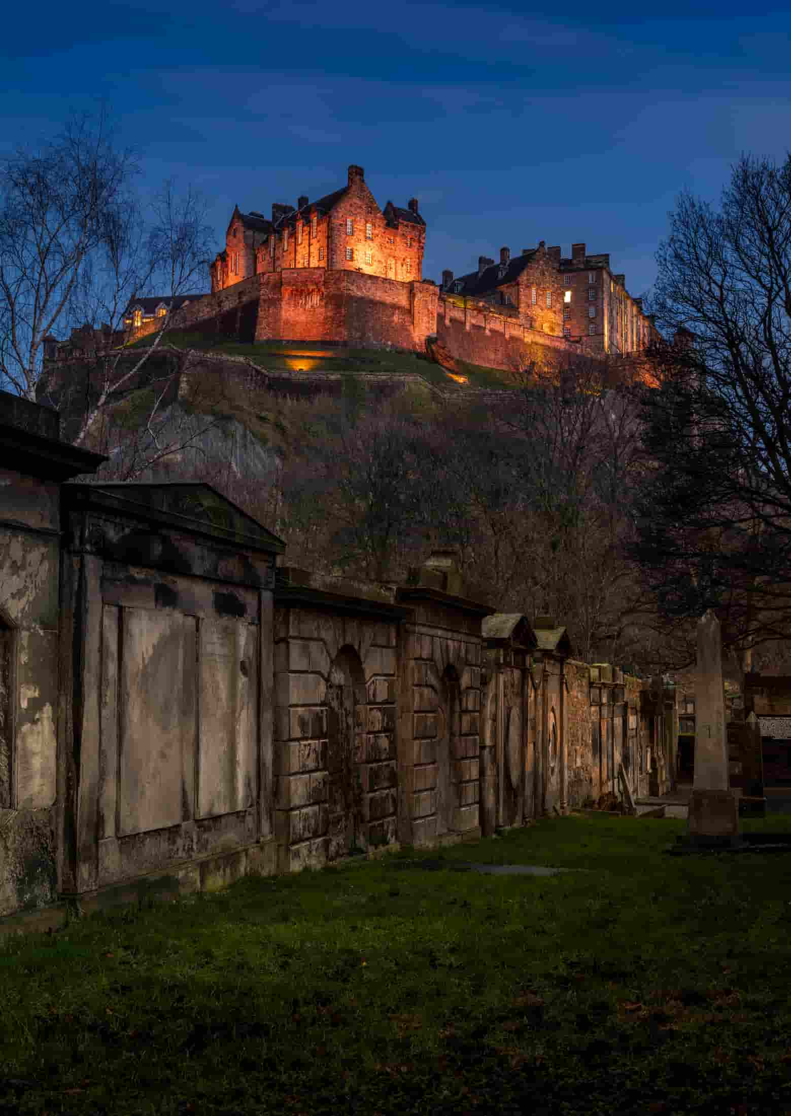 Edinburgh Castle at dusk from St. Cuthbert's Kirkyard