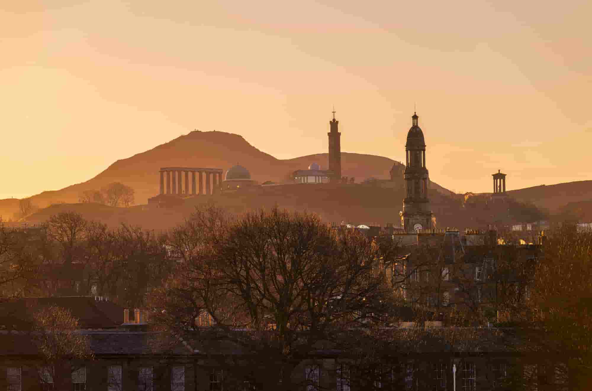 Golden sunrise light at Calton Hill from Eildon Street in Inverleith